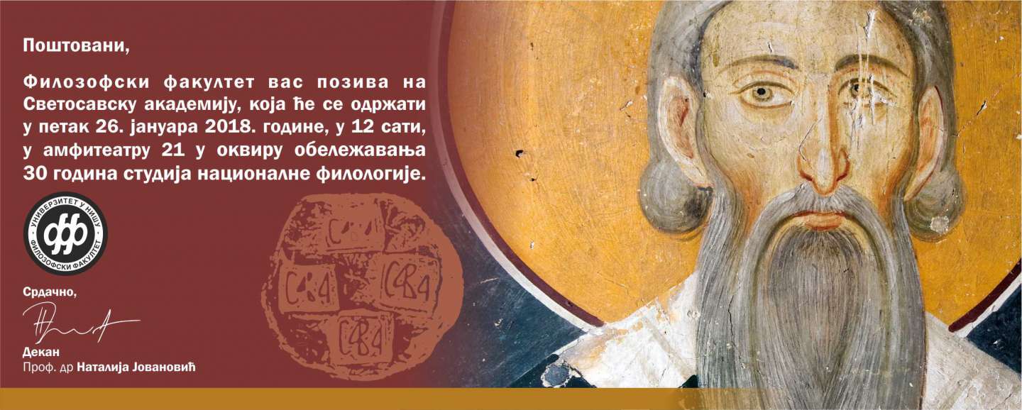 У оквиру обележавања 30 година студија националне филологије на Филозофском факултету Универзитета у Нишу биће организована свечана Светосавска академија.