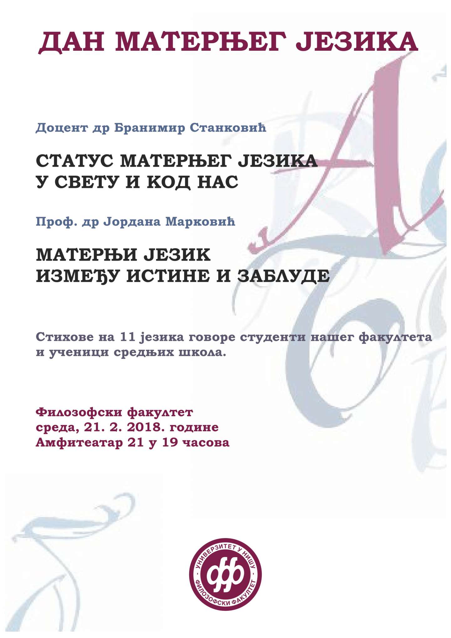 Том приликом ће доц. др Бранимир Станковић говорити о статусу матерњег језика у свету и код нас, док је проф. др Јордана Марковић припремила излагање на тему "Матерњи језик између истине и заблуде". Осим тога, студенти Филозофског факултета и ученици средњих школа говориће стихове на свих 11 језика који се изучавају на Факултету.