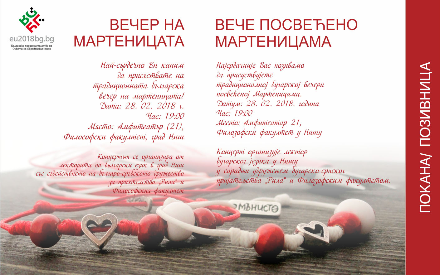 Традиционално бугарско вече посвећено мартеницама и ове године ће од стране лектората за бугарски језик и Филозофског факултета бити организовано на Филозофском факултету.