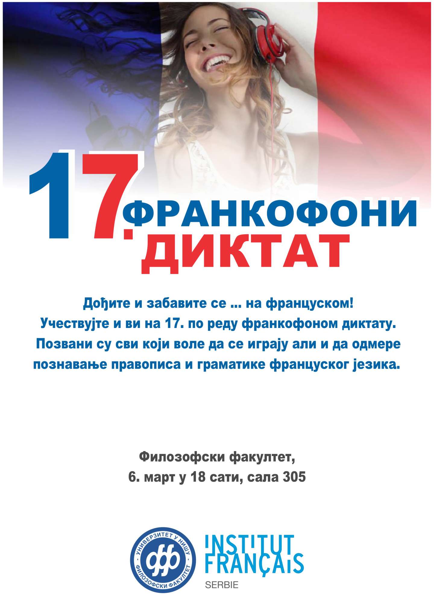 Француски институт у Нишу и Филозофски факултет организују 17. Франкофони диктат који ће се одржати 6. марта у 18 сати у сали 305 Филозофског факултета.