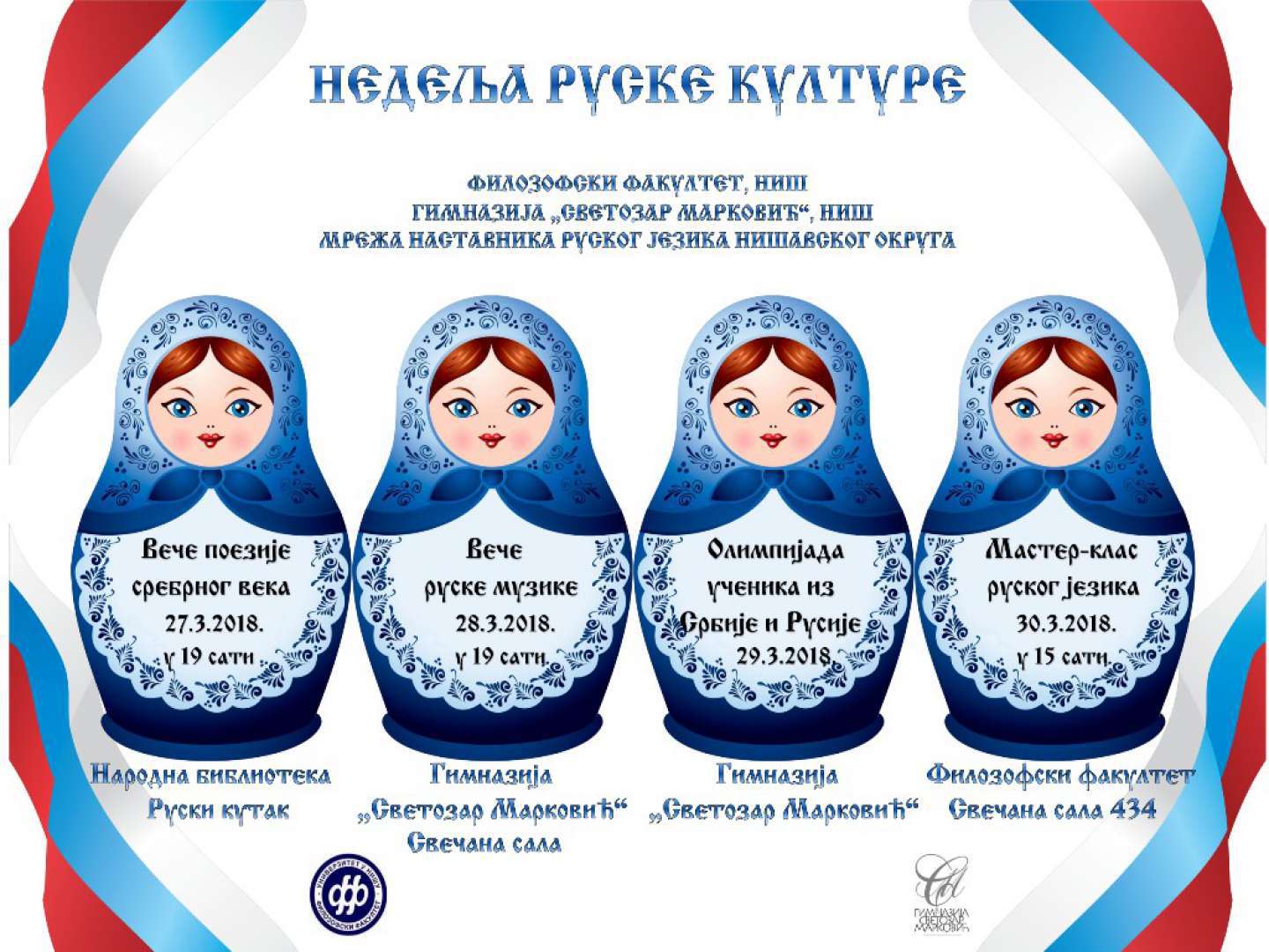 У Руском кутку Народне библиотеке „Стеван Сремац“ 27.3.2018. године отворена је Недеља руске културе у Нишу. Сребрни век руске књижевности представиле су студенткиње Департмана за руски језик и књижевност.